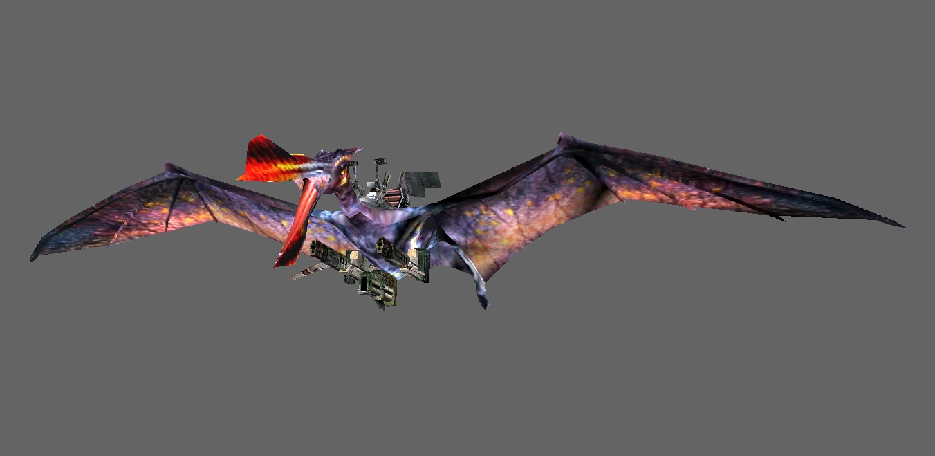 The player mounts the Quetzalcoatlus during five of Turok: Evolution's fifteen chapters in what is referred to as "flight mode." During flight mode, the player has access to the two weapons mounted on the pterosaur's harness: the .50 cal cannon and the rocket pods.