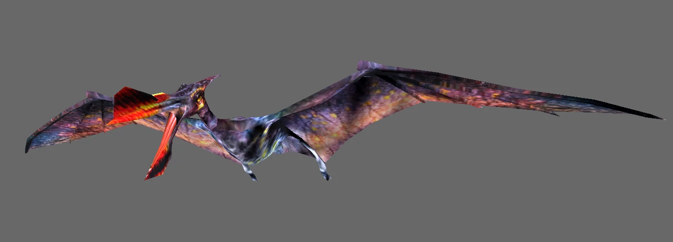 The Quetzalcoatlus of Evolution was a large animal, looking much akin to its Pteranodon cousin with two enormous wings and a large beak. The Quetzalcoatlus of Turok: Evolution features a strange beak, featuring a distinct red coloration with two protuberances, one above and one below. Its skin coloration is deeper purple, which becomes redder around the trailing edges of the wing.